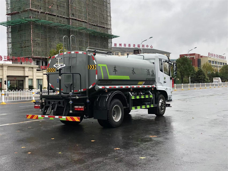 專用功能配置:罐體實際容積約為12.立方米,采用武鋼碳鋼板卷壓成型。配備專用灑水泵,自吸自排。前噴后灑、側噴、后工作平臺及灑水高壓炮。灑水泵垂直自吸高度為6米左右,整車灑水寬度14米左右,后工作平臺水炮可調成:直沖狀、大雨、中雨、小雨、毛毛雨,有效射程≥28米,整車帶消防接頭、水位計,自流閥。后工作平臺主管道有一個一寸的澆花接口,附送2根3米水管,1個爬梯,兩側及后杠。