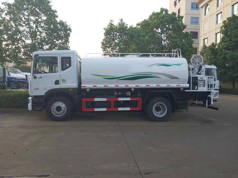 東風灑水車底盤,選裝駕駛室;側噴為選裝件;品名:水;密度:1000千克/立方米;有效容積:9.34立方米;軸距3950mm時,罐體外形尺寸(長×長軸×短軸)(mm):4600×2180×1390,外形尺寸長(mm)/前懸(mm)對應關系:7700/1250,7900/1450;軸距4500mm時,罐體外形尺寸(長×長軸×短軸)(mm):5200×2080×1290;外形尺寸長(mm)/前懸(mm)對應關系8250/1250,8450/1450;ABS型號為3631010-C2000,生產廠家為東科克諾爾商用車制動系統(十堰)有限公司;側面防護裝置材料材質:Q235,連接方式:焊接;后下部防護裝置材料材質:Q235,連接方式:焊接,斷面尺寸(寬×高):30×120(mm),離地高度:500mm.吸程≧7米,灑水寬度≧14-16米,灑水車射程≧25-30米,引水時間<5min,流量60m3/h。前沖(噴)、后灑、帶側噴(花灑)、帶后工作平臺、平臺上安裝綠化灑水高炮(炮噴射形狀可調節:直沖、大雨、中雨、毛毛雨、霧狀、可連續調節,360°旋轉),配消防接口,自流閥,濾網,帶自吸自排功能。配備大功率專用灑水泵,泵可自吸自排,安裝過濾網,帶消防接口,可通過消防栓進水,帶自流閥,隨車選裝20米綠化卷盤,可噴灑農藥,罐體金屬漆。灑水車罐體有橢圓和方圓罐兩種,可根據用戶的要求定做