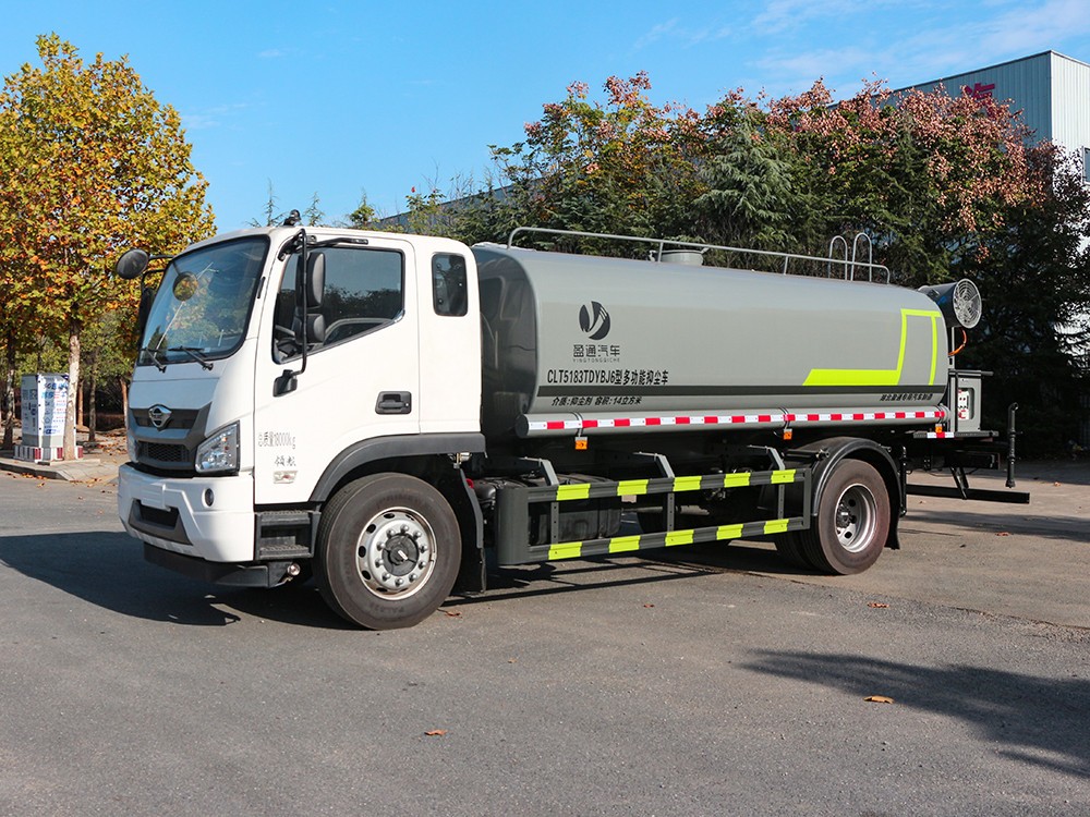 三.產品主要技術參數 序號 名稱 型號、規格 1 整車型號 CLT5187TDYBJ6 型多功能抑塵車 2 發動機型號 YCS06245-60 3 發動機馬力/功率 玉柴 245 馬力/180KW 4 發動機排量 6234ML 5 變速箱 法士特 8 檔(帶高低檔) 6 輪胎規格 10.00 鋼絲胎 7 軸距 4500 8 總質量 18000KG 9 整備質量 8000KG 10 額定載質量 9805KG 11 整車尺寸(長×寬×高) 8.6*2.5*3.2 12 罐體容積 16 方 13 燃料種類 柴油 14 排放標準 國六 15 水泵型號 60/90 16 罐體材質 Q235 碳鋼