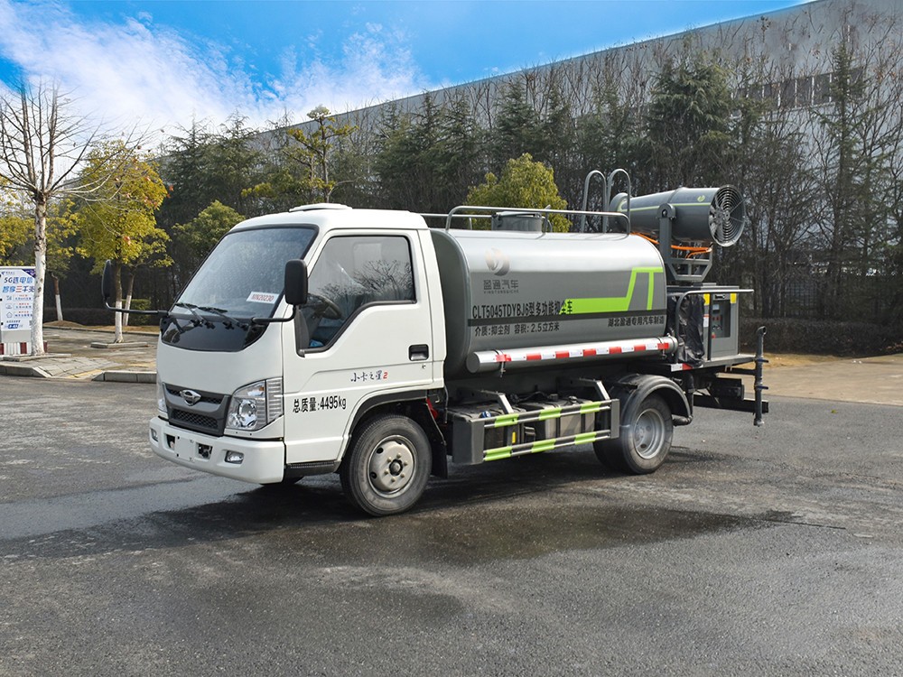 3方霧炮灑水車 整車型號 CLT5045TDYBJ6 型多功能抑塵車 2 發動機型號 Q23-95C60 3 發動機馬力/功率 全柴 95 馬力/70KW 4 發動機排量 2300ML 5 變速箱 蒙沃 5 檔箱 6 輪胎規格 6.00 鋼絲胎 7 軸距 2600 8 總質量 4495KG 9 整備質量 2700KG 10 額定載質量 1665KG 11 整車尺寸(長×寬×高) 5.365*1.9*2.6 12 罐體容積 2.7 方 13 燃料種類 柴油 14 排放標準 國六 15 水泵型號 40/50 16 罐體材質 Q235 碳鋼產品功能展示 霧炮 后灑 后對沖 高炮 側噴