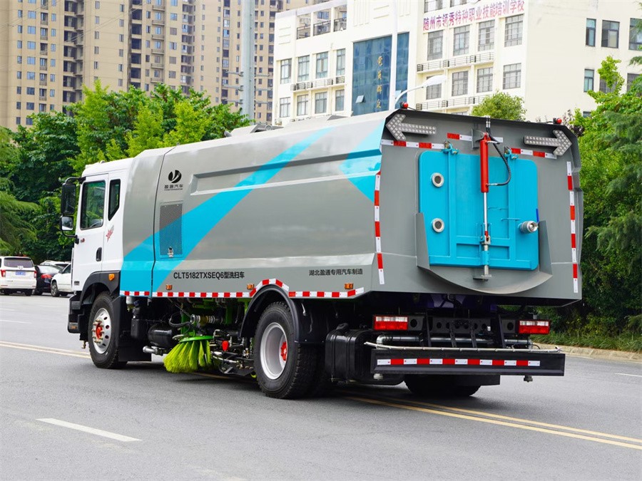 東風18噸清掃車產品特點 1.集掃路車和高壓清洗車功能與一體,實現在一次作業中完成清掃、高壓清洗 和垃圾、污水的 收集。所有功能(全洗掃、全清洗、全掃、左洗掃、右洗掃、 左掃、右掃、左洗、右洗等)可 單獨控制,也可聯動控制。 2.車輛配有冷暖空調,液壓方向助力,右影像、倒車影像,工作音樂喇叭