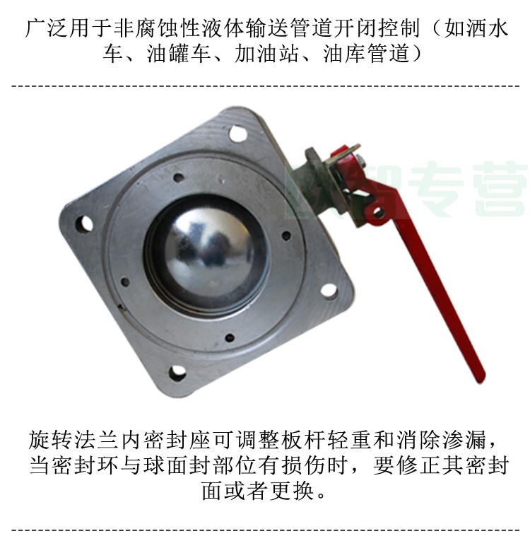 綠化灑水車配件-直通球閥 直通球閥又稱二通球閥,方法蘭,鋁合金產品,防腐防銹。直通球閥用途:廣泛使用在灑水車,油罐車,化工車,消防車等專用汽車上直通球閥型號:DN50,DN65,DN80,DN100。直通球閥特點:球閥采用鋁合金殼體,不銹鋼球芯,具有材料配制合理結構緊湊,重量輕,體積小,使用方便等優點,設有限位和加鎖裝置,安全可靠。直通球閥調整:旋轉法蘭內密封座可調整板桿輕重和消除滲漏,當密封環與球面封部位有損傷時,要修正其密封面或者更換。