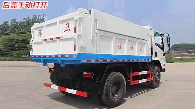箱體容積5~6立方米,箱長3.6米,箱寬2.2米,箱高0.5米,邊三底四碳鋼材質,雙杠液壓自卸,帶液壓蓋板,可向兩邊展開折疊,尾部手動開啟。