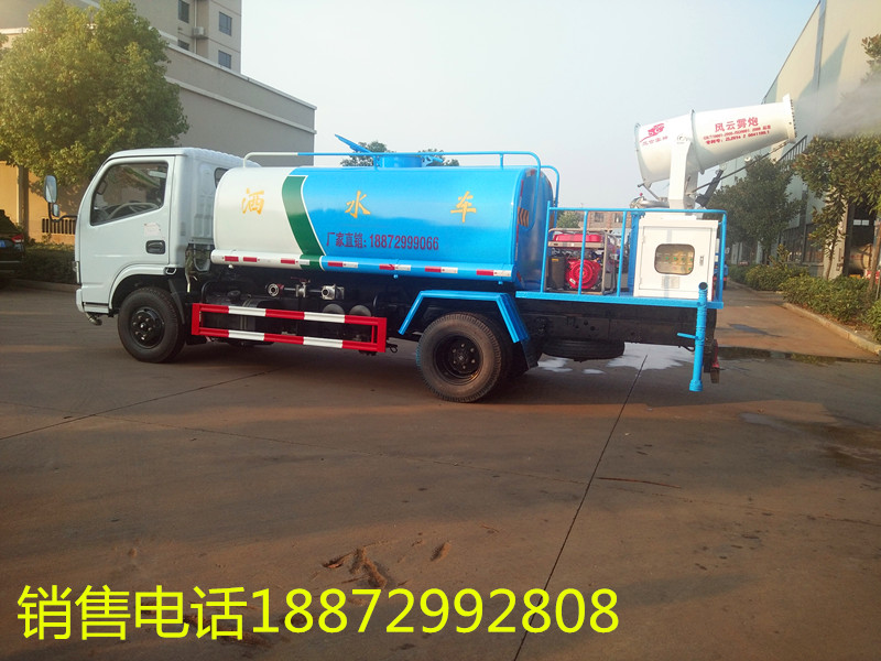 國六東風小多利卡帶霧炮5方灑水車采用 大功率水泵,灑水車前沖(噴)后灑,帶側(cè)噴,帶65消防接口,后平臺帶泡不帶門,前封頭帶水位計,后平臺主管路帶1寸澆花接口,后爬梯,配3米長抽水鋼絲塑料管兩根,用于抽水作業(yè)使用;罐后帶工作平臺,平臺上帶安全護欄,裝高位綠化灑水炮一個,灑水炮可全方位360度旋轉(zhuǎn),可連續(xù)調(diào)成直沖狀、大雨、小雨、毛毛雨等不同噴灑方式,調(diào)成直沖狀射程長度≥28m、高度≥12m,調(diào)成細雨狀射程寬度≥15m;后工作平臺下用槽鋼連接焊有5mm厚保險杠,提高灑水車的主動安全性,泵可自吸自排,安裝過濾網(wǎng),帶消防接口,可通過消防栓進水,帶自流閥,隨車選裝20米綠化卷盤,可噴灑農(nóng)藥