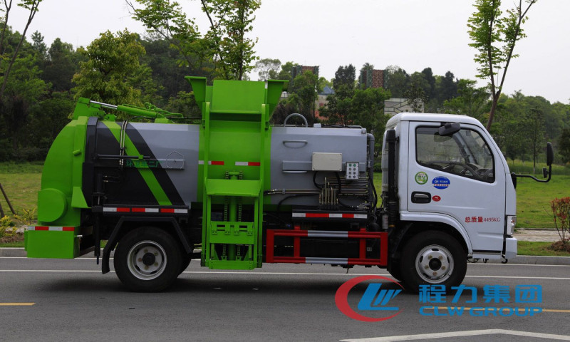 方形廂式餐廚垃圾車標配:弧形箱體,箱體材質為4~6mm,長源油泵,揚州中梅多路閥,海普瑞斯油缸,推鏟卸料(不帶舉升功能),具有干濕分離功能,后蓋液壓控制,帶耐磨腐蝕硅膠密封條,后門液壓鎖緊,拉桿式提升機,掛240L標準塑料垃圾桶,進料口蓋液開關,駕駛室內集中電控(提升機外部手動控制),后門鎖緊與后蓋開關的操作具有防誤操作功能,箱體帶清洗裝置(液壓馬達帶動高壓泵、帶水箱),部分車型清洗裝置為選裝。