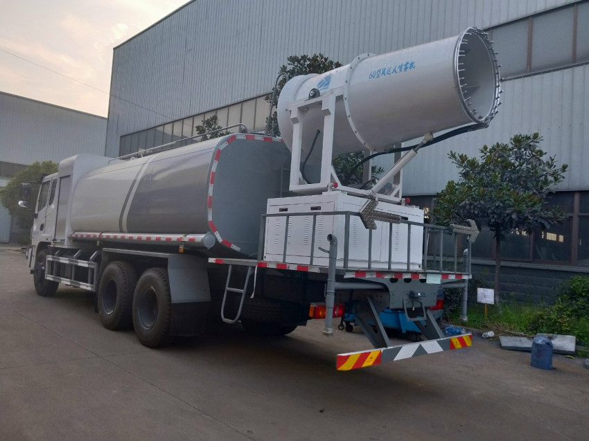 抑塵車吸程≧7米,灑水寬度≧14-16米,射程≧25-40米,引水時間<5min,流量60m3/h。前沖(噴)、后灑、帶側噴(花灑)、帶后工作平臺、平臺上安裝綠化灑水高炮(炮噴射形狀可調節:直沖、大雨、中雨、毛毛雨、霧狀、可連續調節,360°旋轉),配消防接口,自流閥,濾網,帶自吸自排功能。配備大功率專用灑水泵,泵可自吸自排,安裝過濾網,帶消防接口,可通過消防栓進水,帶自流閥,此車尾部加裝大功率農藥噴灑炮,噴灑狀態霧狀,有效射程15-45米,外部平臺帶獨立的機組。