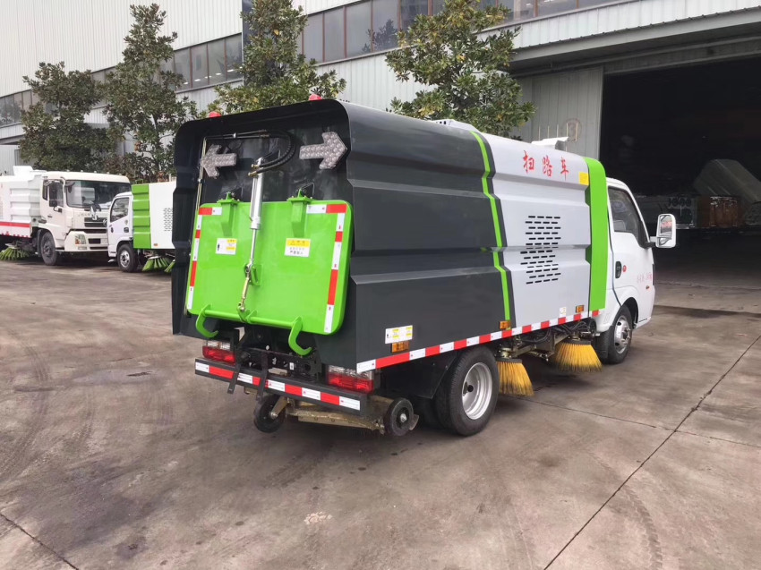 小型掃路車裝標配:帶4個掃盤、江鈴發動機、三洋馬達、施耐德控制開關、海普瑞斯電磁閥組、無級變速自動離合器、免維護離心式自動風機、不銹鋼垃圾箱、尾部LED箭頭指示燈、手動泵應急系統、中聯北極星電子水泵,垃圾舉升自卸功能。