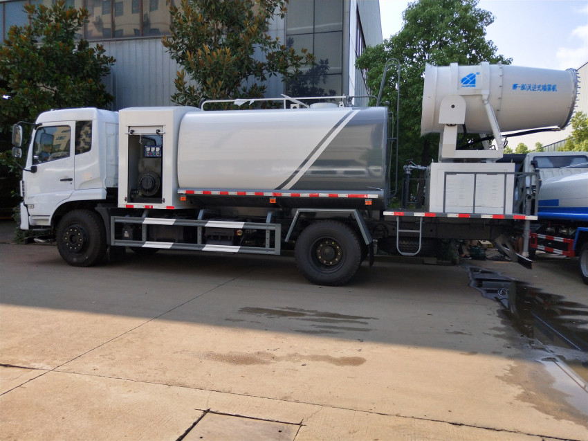 前噴后灑,前裝有鴨形噴嘴或圓頭沖嘴,后面裝有圓柱開灑水噴嘴或蓮蓬頭噴嘴,后部有一工作平臺,裝配有高壓水炮。后部還可裝8個噴嘴(選裝)噴水器一般用于沖洗街道。