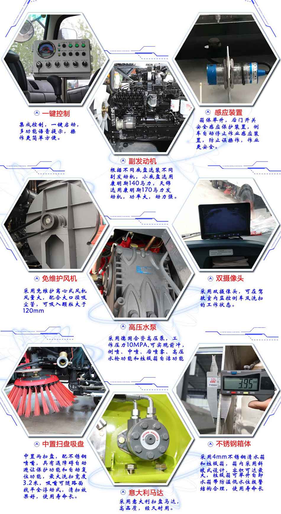 上裝配置:副發(fā)動機(jī)采用康明斯170馬力,自動離合器驅(qū)動風(fēng)機(jī)和高壓水泵,有效減少風(fēng)機(jī)啟動和停止時對發(fā)動機(jī)的沖擊,低噪音,低油耗量和節(jié)省成本等優(yōu)點。采用洛陽北玻品牌,大功率耐磨免維護(hù)離心風(fēng)機(jī),無嗓音,效率高風(fēng)量大,使用壽命長。高壓水泵采用合資國際知名德國品孚,T7012IR型柱塞柱,壓力高,最高壓力可達(dá)到16MPa。清水箱充分利用車載空間,容積達(dá)到9個方,內(nèi)置水位報警器。垃圾箱采用雙層內(nèi)膽不銹鋼結(jié)構(gòu),內(nèi)部加裝過濾網(wǎng)板,有效地防止樹葉,塑料袋之類的輕飄物堵塞風(fēng)口及灰塵排出,內(nèi)置污水報警系統(tǒng),可通過后門處污水閥方便的將污水排出下水道,最大限度的利用了垃圾箱裝載垃圾的空間,廂體采用傾翻卸料,帶高壓沖洗自潔裝置。