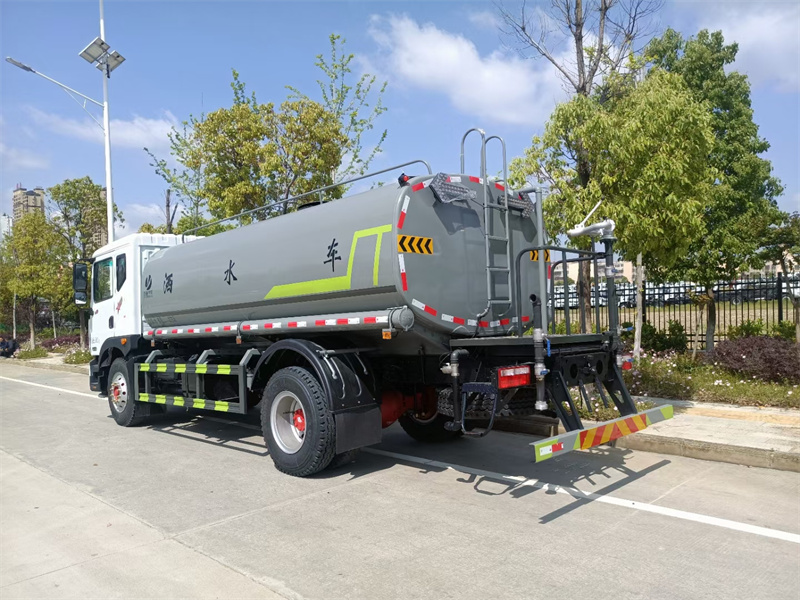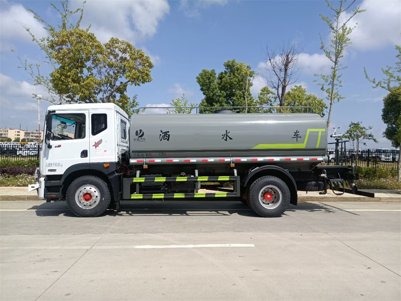 東風15方灑水車產品主要技術參數 序號 名稱 型號、規格 1 整車型號 CLT5183GPSEQ6A 型綠化噴灑車 2 發動機型號 D4.0NS6B195 3 發動機馬力/功率 康明斯 195 馬力/143KW 4 發動機排量 4000ML 5 變速箱 法士特 8 檔(帶高低檔) 6 輪胎規格 10.00 鋼絲胎 7 軸距 4500 8 總質量 18000KG 9 整備質量 7300KG 10 額定載質量 10505KG 11 整車尺寸(長×寬×高) 8.45*2.5*3.2 12 罐體容積 16 方 13 燃料種類 柴油 14 排放標準 國六 15 水泵型號 60/90 16 罐體材質 Q235 碳鋼產品功能展示 前沖鴨嘴 后灑 后對沖 高炮 高位花灑 側噴