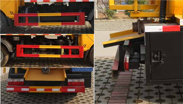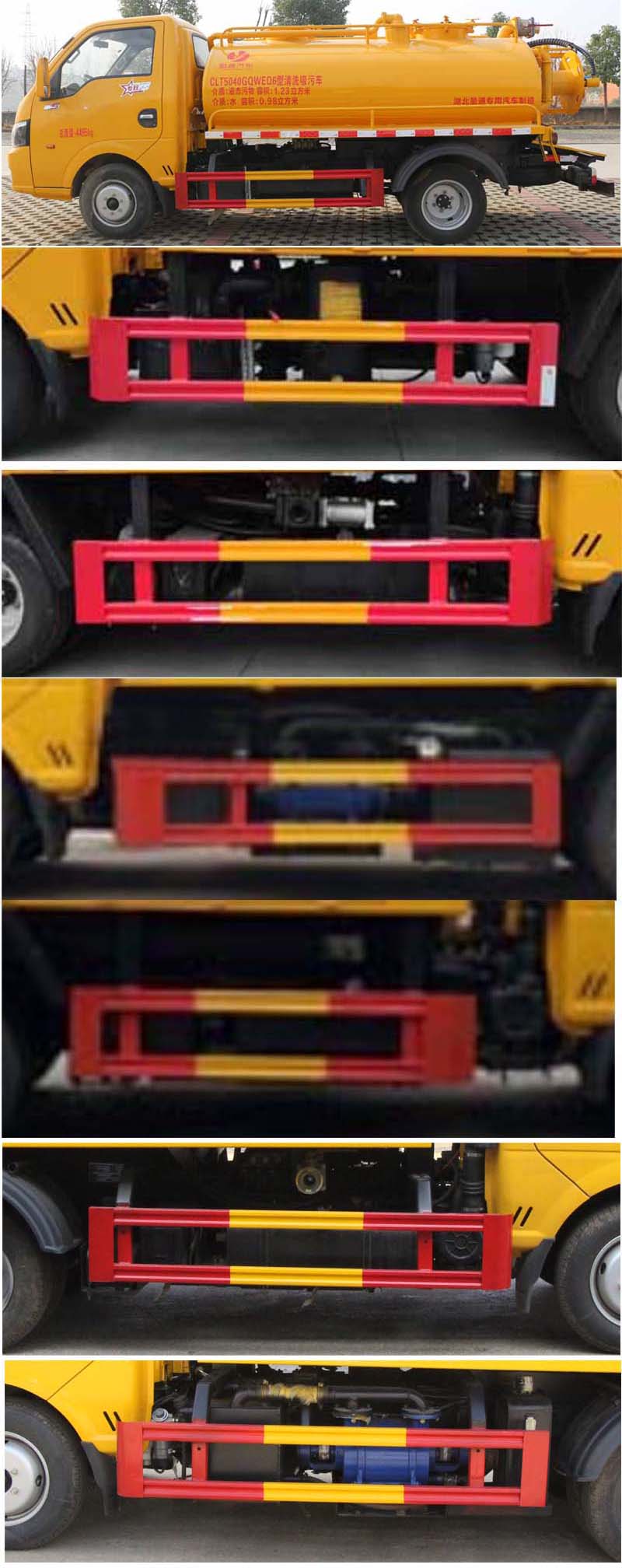 該車用于下水道排污及疏通,專用裝置:罐體及清洗吸污裝置;罐體外形尺寸(長×長軸×短軸)(mm):2800×1550×1000,罐體前段為清水罐(長1590mm,其中前端下部1100mm用于安裝高壓泵);后段為污水罐(長1210mm);污水罐總容量:1.29立方米,污水罐有效容積:1.23立方米,介質:液態污物,密度800千克/立方米;清水罐總容量:1.03立方米,清水罐有效容積:0.98立方米,介質:水,密度1000千克/立方米,清水罐和污水罐為獨立罐體,清洗功能時用清水罐,吸污功能時用污水罐,污水罐和清水罐不可同時滿載,兩罐不能同時滿載使用;ABS型號/廠家:APG3550500A/浙江亞太機電股份有限公司;選裝ABS廠家及型號:襄陽東風隆誠機械有限責任公司/ABS/ASR-12V-4S/4M.側、后防護材料均為:Q235碳鋼,連接方式均為:螺栓連接,后部防護截面尺寸(mm):100×50,后部防護離地高度(mm):360.僅采用底盤2800mm軸距改裝.選裝油箱及電瓶位置。隨底盤選裝駕駛室。