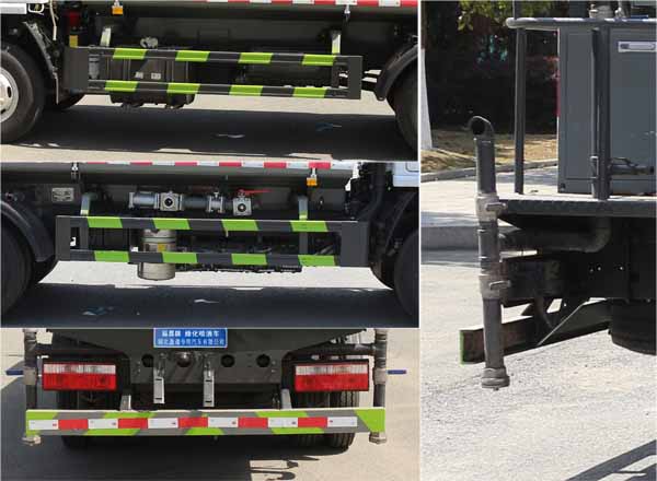 東風福瑞卡5方灑水車產品標配前噴(鴨嘴)、后沖、后灑、側噴、后置式工作 平臺,平臺上配置綠化水炮(可 360°旋轉,既可以調成柱狀,也可 以調成霧狀,更可以調成直沖狀、大雨、中雨、小雨、毛毛雨),配 備優質大功率專用灑水泵(可自吸自排,可從河里或池塘抽水到罐體), 取力器,雜物過濾網,消防接口,自流球閥系統、取力器、球閥、濾網 均為國家標準產品,主管道加粗,法蘭墊、法蘭盤加厚,大通徑球閥。 整體具備性能優良安全可靠、效率高、流量大、維修方便等特點。