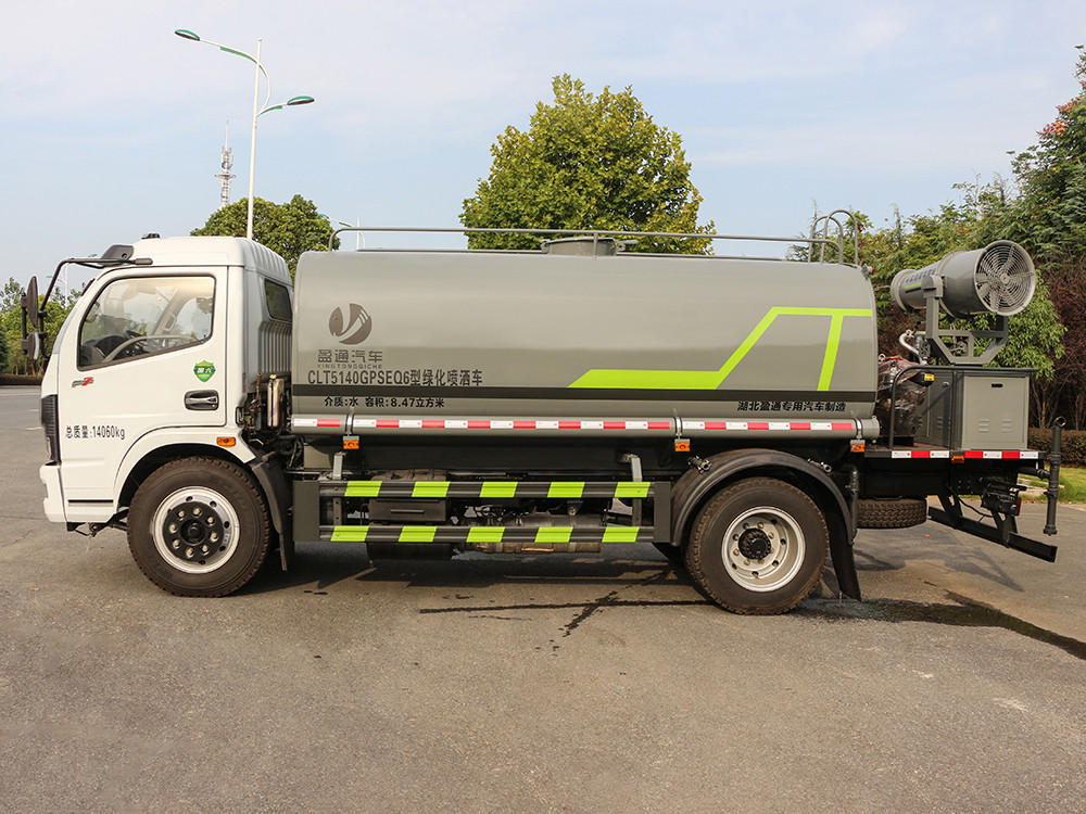 東風8方霧炮灑水車整車型號 CLT5121GPSEQ6 型綠化噴灑車 2 發動機型號 D25TCIF1 3 發動機馬力/功率 云內 150 馬力/110KW 4 發動機排量 2499ML 5 變速箱 5 檔帶副變速 6 輪胎規格 245 真空胎/8.25 鋼絲胎 7 軸距 3390 8 總質量 11900KG 9 整備質量 4900KG 10 額定載質量 6805KG 11 整車尺寸(長×寬×高) 6.45*2.25*2.8 12 罐體容積 8 方 13 燃料種類 柴油 14 排放標準 國六 15 水泵型號 40/50 16 罐體材質 Q235 碳鋼