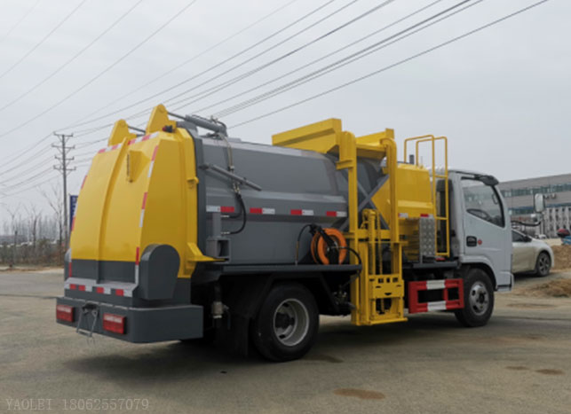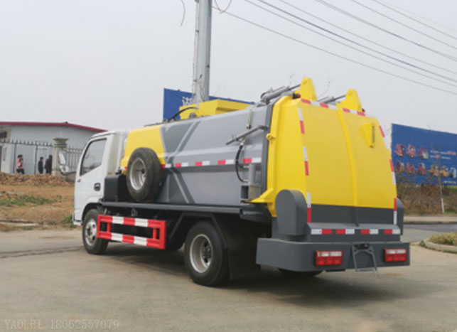 東風小多利卡餐廚垃圾車改裝容積4~5m3,罐體厚度4.75mm,配備掛桶提升機構,后蓋液壓開啟,罐體可以舉升自卸,尾部帶自流閥。