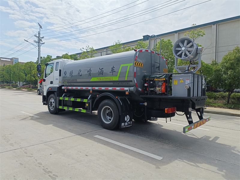 產品簡述:縱昂牌 CLT5188GPSEQ6A 型綠化噴灑車標配前噴(鴨嘴)、后對沖、 后灑、側噴、后置式工作平臺,平臺上配置綠化水炮(可 360°旋轉,既可以調 成柱狀,也可以調成霧狀),配備優質大功率專用灑水泵(可自吸自排,可從河 里或池塘抽水到罐體),取力器,雜物過濾網,消防接口,自流球閥系統、取力 器、球閥、濾網均為國家標準產品,主管道加粗,法蘭墊、法蘭盤加厚,大通徑 球閥。整體具備性能優良安全可靠、效率高、流量大、維修方便等特點