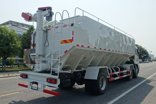國六東風天錦小三軸散裝飼料運輸車-30方散裝飼料車:東風天錦VR駕駛室,康明斯245馬力發動機,法士特8檔變速箱,1800+5000mm/1800+4100mm軸距,11.00R20鋼絲胎,電動門窗,中控鎖,原廠空調,ABS,方向助力,鋁合金擋泥板,帶環保和燃油,上戶辦營運證無憂!上裝采用武鋼優質碳鋼板,三條絞龍,頂部絞龍可180度旋轉,分設四個倉,可獨立控制各個倉的卸料順序和速度!