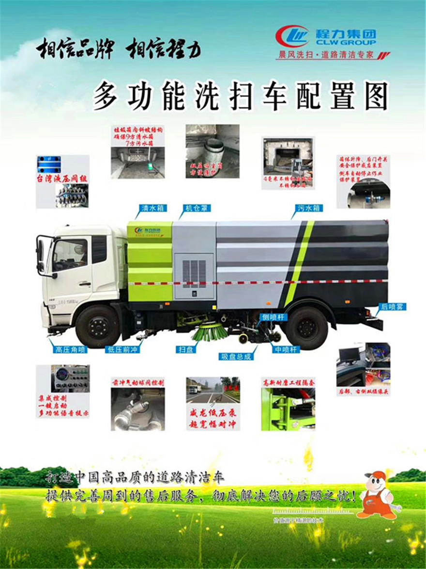 東風8方洗掃車具有路面清洗、路面清掃路緣和路緣石立面洗刷、低壓沖洗、噴霧除塵等多功能。有“全洗掃”、 “左洗掃”、 “右洗掃”、 “全掃”、 多種作業模式可選擇。選擇“全洗掃”模式清洗廣場和路面,清洗效率高效果好,洗凈率達95%以上。選擇“左洗掃”或“右洗掃”模式清洗路面和路緣 。需要進行路面清掃或路面保潔作業時,可選擇掃路模式。需要噴霧除塵時,可開啟噴霧裝置,進行噴霧除塵作業。可以像灑水車一樣對路面進行低壓沖洗作業。