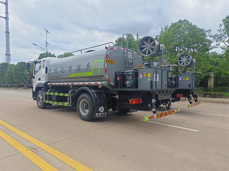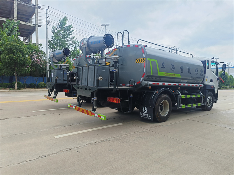 罐體約為 15 方、邊燈帶電,罐體尾部上方標配 2 個紅色示寬燈 、前噴為鴨嘴直沖,標配后對沖,用戶可根據自己的需求,來調整對沖位置 、沖孔平臺(承載能力加強),炮筒后蓋為定制型螺栓卡扣 、前噴、后對沖、后灑球閥均采用 50 大通徑不銹鋼球閥 、新式軸承式水炮,更加耐用。配 60-90 型水泵 、側噴和高炮管道加粗并配 65 大通徑不銹鋼球閥,壓力更大 、防腐法蘭墊片 、鋁制后灑,不易炸開 、罐體自動焊(美國林肯焊機及電源),拼板自動焊接封頭環縫焊接,無氣 孔焊縫美觀 、爬梯、側護網、后保險杠均為螺栓連接方便拆卸維修 、塑料擋泥板替代鐵擋泥板更加輕便,用螺栓連接方便拆卸 、前部、后部主管連接處為 6 孔圓法蘭連接不易沖墊