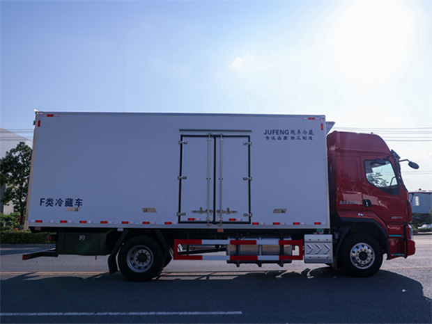 柳汽乘龍6米8冷藏車廂體配置為:斷橋隔溫工藝,整體結構框架,內外面料為3mm新款啞光玻璃鋼夾保溫層真空復合而成,廂體厚度為8cm,最新款鋁合金包邊型材,型材局部厚度為4mm(鋼制鉚釘加固),廂體內部采用2個LED照明燈及廂體示寬燈,后門框不銹鋼材質,門框密封條為三元乙丙橡膠材質,加厚型不銹鋼合頁及鎖件;副梁為Q700車用大梁鋼,15mm厚大梁墊皮,加裝防撞膠塊,不銹鋼門鎖件,配后雙開門,副駕駛一側居中靠前開單側門一個,帶2個排水孔。