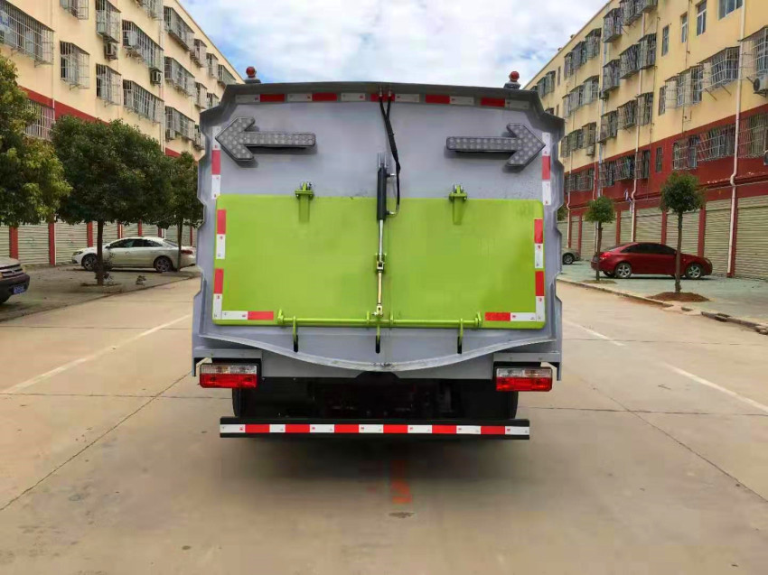 7. 垃圾箱采用雙層內膽不銹鋼結構,內部加裝過濾網板,能有效地防止樹葉、塑料袋之類的輕飄物堵塞風口及灰塵的排出。內置污水報警系統,通過后門處污水閥方便的將污水排至下水道,最大限度的利用了垃圾箱裝載垃圾的空間。廂體采用傾翻卸料,帶高壓沖洗自潔裝置。