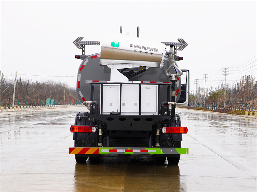 福田12-15噸電動灑水車該車主要用于城鄉園林綠化,路面噴灑;主要裝置為罐體及噴灑裝置.罐體總容量:10.6立方米;罐體有效容積10.1立方米;介質:丙酮水溶液,密度950千克/立方米,罐體外形尺寸(長×長軸×短軸)(mm):4600×2300×1450.側防護采用電池護罩代替,材料為Q235碳鋼,螺栓連接;后防護材料為:Q235碳鋼,連接方式為:螺栓連接,后部防護截面尺寸(mm):120×50,后部防護離地高度(mm):490;ABS型號/生產企業:ABS-E/采埃孚商用車系統(青島)有限公司;電池種類:磷酸鐵鋰電池,儲能裝置單體生產企業:寧德時代新能源科技股份有限公司,儲能裝置總成生產企業:寧德時代新能源科技股份有限公司;電機型號/生產企業:TZ375XSSF-SZF611/陜西法士特齒輪有限責任公司,額定功率:105kW,峰值功率:175kW.選裝前部電子水炮樣式,選裝前部不帶電子水炮,該狀態下車長為8100mm;當前部安裝電子水炮時,車長為8600mm,車輛前伸500mm.后部箭頭指示燈僅在車輛作業時開啟.選裝車輛前部鴨嘴裝置.選裝噴灑裝置樣式.選裝管道口位置.選裝側防護裝置樣式,側防護材料為鋁合金+Q235碳鋼,連接方式為螺栓連接.