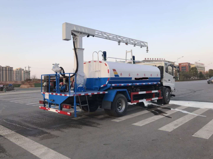 抑塵車上裝配置:罐體為4.5方方形罐,前沖、后灑、側(cè)噴、高炮,抑塵噴灑桿(帶旋轉(zhuǎn)伸縮功能)。噴灑桿離地3.5-4.5米 ,后部平臺帶8KW副發(fā)電機組,罐體內(nèi)部加兩個1.5KW電動馬達(帶攪拌功能)罐體噴漆上白下藍,平臺和噴灑桿藍色。遙控操作噴灑桿上下左右旋轉(zhuǎn),電控箱安裝在后部平臺。