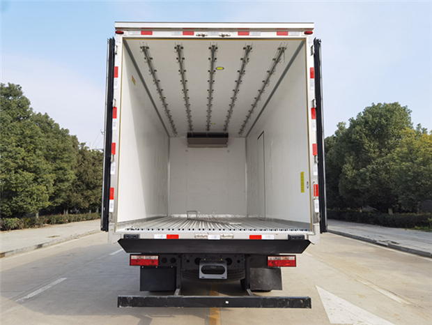 江淮格爾發6米8冷藏車廂體配置為:斷橋隔溫工藝,整體結構框架,內外面料為3mm新款啞光玻璃鋼夾保溫層真空復合而成,廂體厚度為8cm,最新款鋁合金包邊型材,型材局部厚度為4mm(鋼制鉚釘加固),廂體內部采用2個LED照明燈及廂體示寬燈,后門框不銹鋼材質,門框密封條為三元乙丙橡膠材質,加厚型不銹鋼合頁及鎖件;副梁為Q700車用大梁鋼,15mm厚大梁墊皮,加裝防撞膠塊,不銹鋼門鎖件,配后雙開門,副駕駛一側居中靠前開單側門一個,帶2個排水孔。