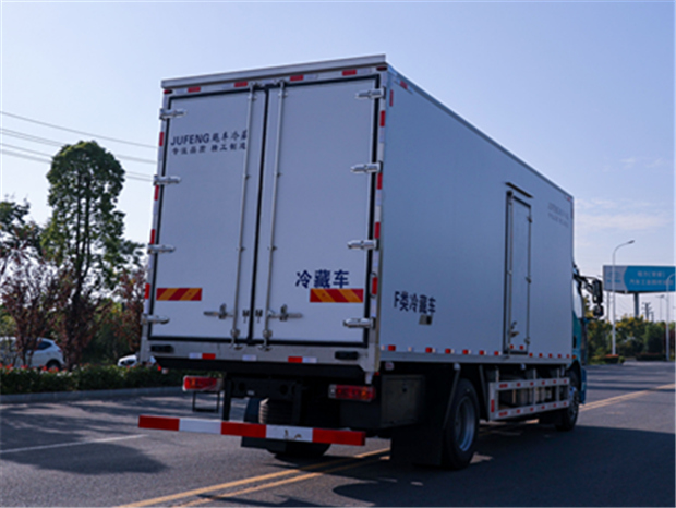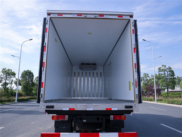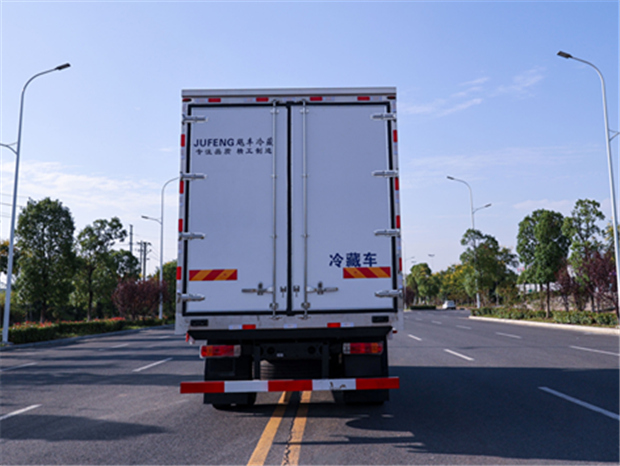 解放J6L 6米8冷藏車廂體配置為:斷橋隔溫工藝,整體結構框架,內外面料為3mm新款啞光玻璃鋼夾保溫層真空復合而成,廂體厚度為8cm,最新款鋁合金包邊型材,型材局部厚度為4mm(鋼制鉚釘加固),廂體內部采用2個LED照明燈及廂體示寬燈,后門框不銹鋼材質,門框密封條為三元乙丙橡膠材質,加厚型不銹鋼合頁及鎖件;副梁為Q700車用大梁鋼,15mm厚大梁墊皮,加裝防撞膠塊,不銹鋼門鎖件,配后雙開門,副駕駛一側居中靠前開單側門一個,帶2個排水孔。