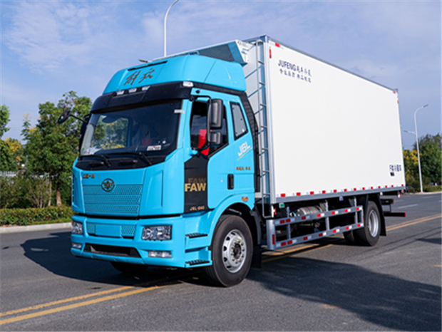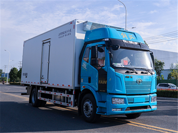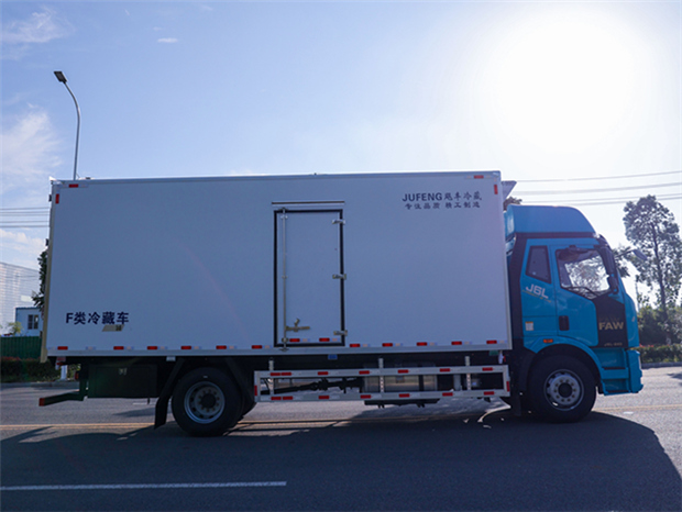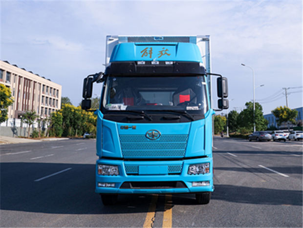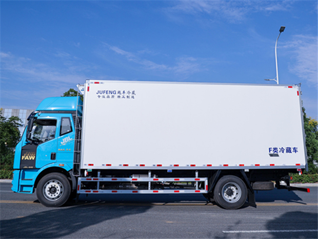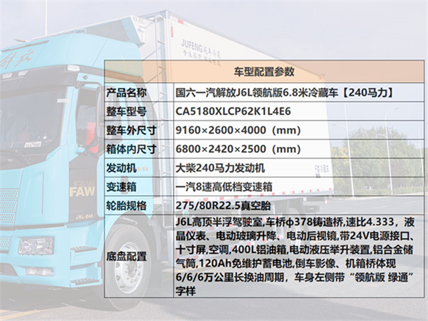 解放J6L 6米8冷藏車車身配置為:J6L精英版全浮高頂排半駕駛室,顏色為粉綠色(可選紅色,白色),液晶儀表、電動玻璃升降、電動后視鏡、側圍網兜、后圍窗簾導軌、全景窗簾導軌、頭頂放物盒、駕駛員座椅為真皮通風空氣座椅(腰托、扶手)、中間座椅、帶24V電源接口、十寸屏、多功能大角度方向盤 自動空調、前下防護裝置、400L鋁油箱、一體式金屬寬體保險杠、駕駛室四點螺簧懸置、電動液壓舉升裝置、鋁合金儲氣筒、120AH免維護蓄電池、LED轉向燈、霧燈帶輔助遠光、懸架7/7+3、水壺座、定速巡航、VOSS管路及接頭、機箱橋體現6/6/6萬公里長換油周期、右轉彎音響提示、限速89km/h、T-box1.5、安全帶佩戴提醒、制動器襯片更換報警、金色鷹標、車身左側帶“精英版”字樣、排氣節流閥,大柴CA6DH1-24E6,240馬力發動機,(EGR+DOC+DPF+SCR氣驅),ф395離合器,變速箱CA8TAX090M變速器,車橋ф378鑄造橋(自動調整臂、國產ABS、1860輪距) 9T橋,4.333,車架:237×75×6.5,275/80R22.5型18層級無內胎(土樓輪輞、國內一線品牌)。
