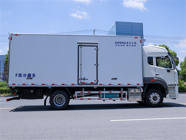 重汽豪沃6米8冷藏車廂體配置為:斷橋隔溫工藝,整體結構框架,內外面料為3mm新款啞光玻璃鋼夾保溫層真空復合而成,廂體厚度為8cm,最新款鋁合金包邊型材,型材局部厚度為4mm(鋼制鉚釘加固),廂體內部采用2個LED照明燈及廂體示寬燈,后門框不銹鋼材質,門框密封條為三元乙丙橡膠材質,加厚型不銹鋼合頁及鎖件;副梁為Q700車用大梁鋼,15mm厚大梁墊皮,加裝防撞膠塊,不銹鋼門鎖件,配后雙開門,副駕駛一側居中靠前開單側門一個,帶2個排水孔。